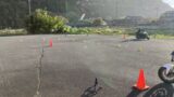 15時枠、フロントは温間2.2に上げて、リアはそのまま温間2.0に。感触は上々、しかも、これまでのベストタイムを更新して51.738を出しました。仮想トップ(44.8)比で115.49%。ただ、グリップ感はいいものの、回転でハンドルが急激に切れる問題が未だに残っています。空気圧を上げるとハンドルが切れにくくはなる印象ですが、これ以上空気圧を上げると今度はグリップが心配な感じです。そこで次は、フォークの突き出し量を変えてみることに。