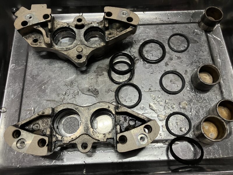 つづいて、ピストンが戻りづらくなっていたフロントキャリパーのオーバーホールを行い、シールの交換を行います。