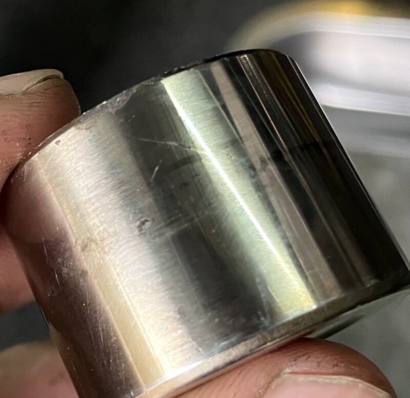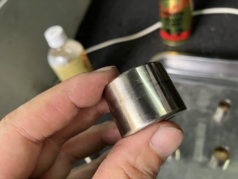 よく見たら、斜めに傷が入っていますね。と言っても、新しいピストンがあるわけでもないし、そんなに深くなさそうだったので、軽く磨いて様子見。これで漏れてくるようだったら、ピストンを交換します。