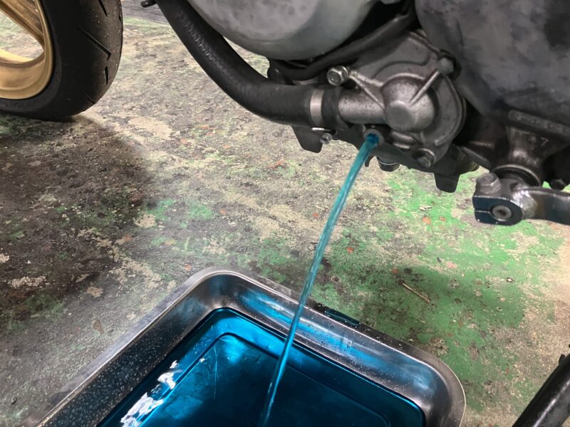 ドレンから夏用のクーラントを抜きます。