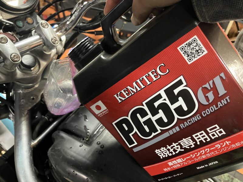 リザーバータンクのクーラントも抜ききったら、冬用のクーラントを入れていきます。その後、エア抜きをして完了。