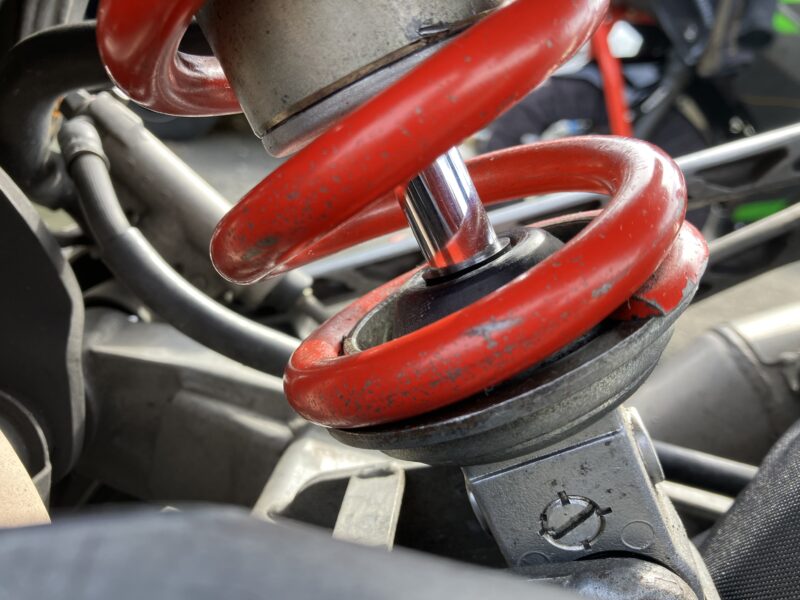 別の日、リアサスペンションが仕様変更から返ってきたので、さっそく車体に取り付けます。