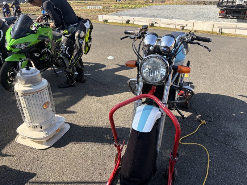 朝の寒空の下、整備していると、トランポお隣になった佐藤さんがストーブを焚いてくださいました。おかげさまで凍え死ななくて済みました。