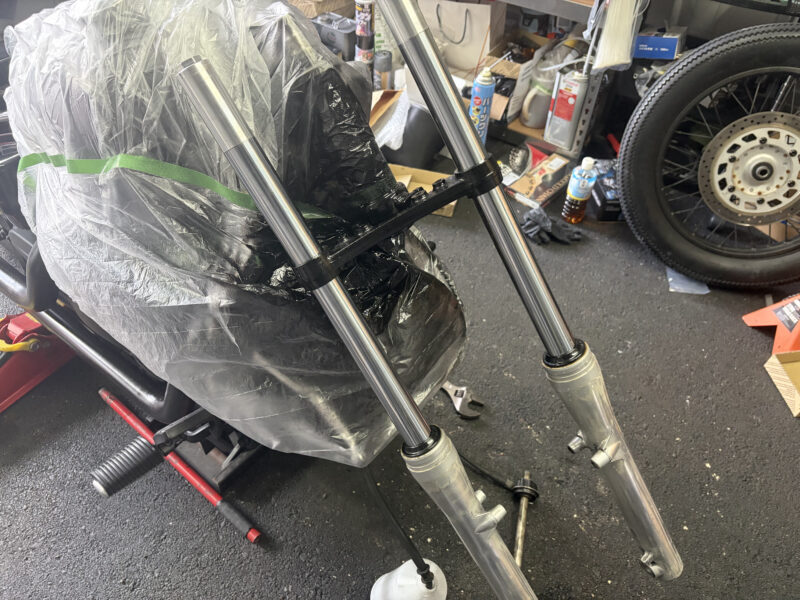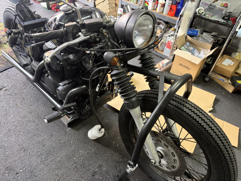 今回のお客様?はこちら。ヤマハのドラッグスター250。何やら色々な作業が同時並行で進んでいるようで、僕が見たときには、キャリパーが外れていたり、トップブリッジが外れていたり、、、