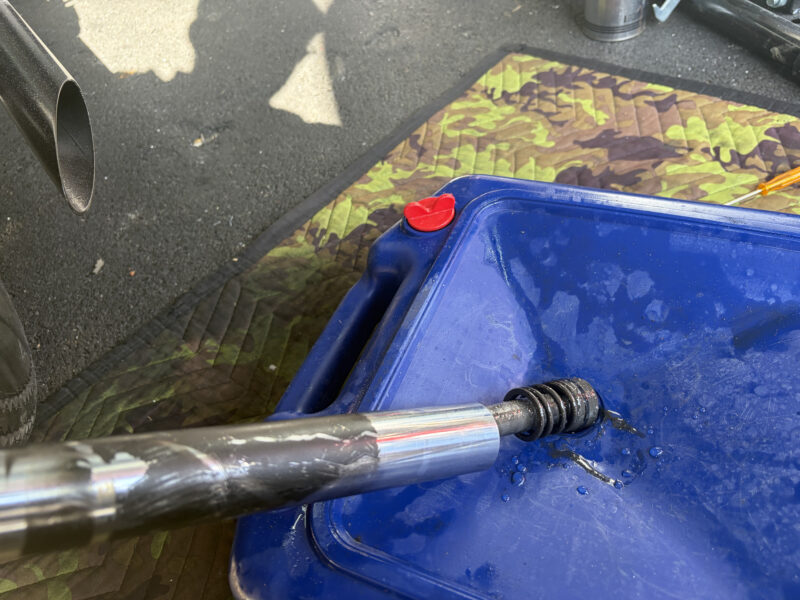 ボルトが外れればこっちのもの。フォークをひっくり返してダンパーロッドを出します。
