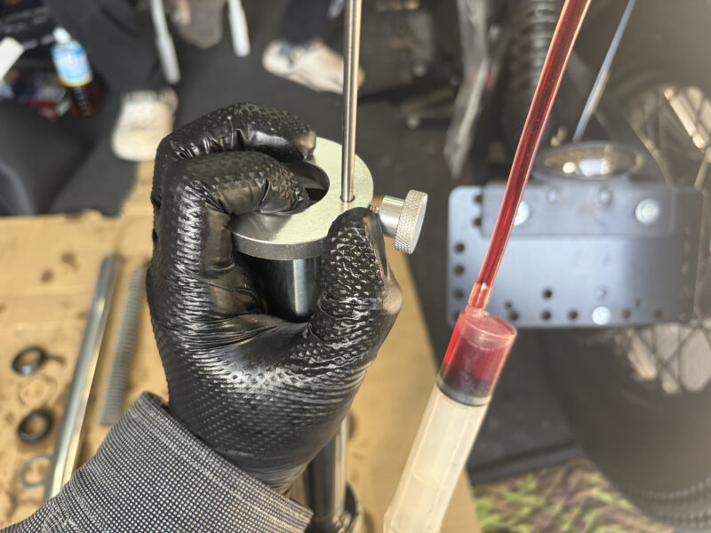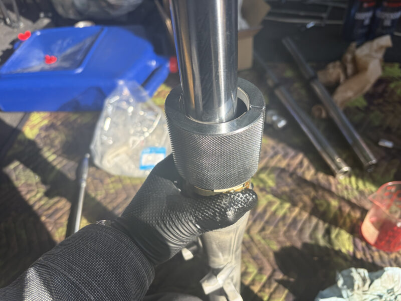 トップキャップを外し、中のカラー・ワッシャーを取り出して、古いフォークオイルを排出します。