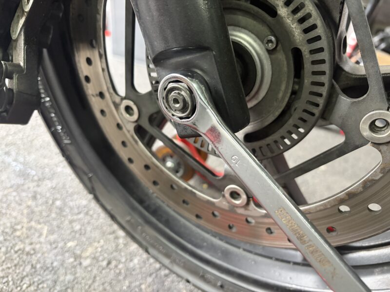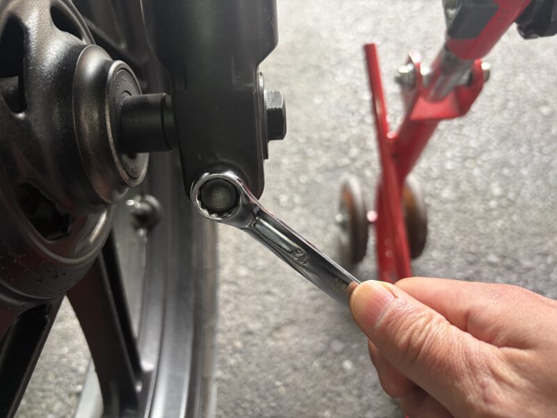 まずは、アクスルシャフトの割り締めボルトを12ミリのメガネレンチで緩めます。ホイールを外すだけなら緩めるだけ、ボルトを抜かなくてもいいのですが、今回はフォークのオーバーホールでこのボルトが邪魔になるので、ここで抜いてしまってもいいでしょう。