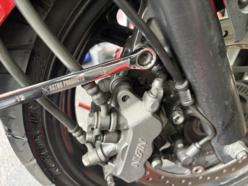 つづいて、ブレーキキャリパーを外します。12ミリのメガネレンチで、キャリパーボルト2本を外します。