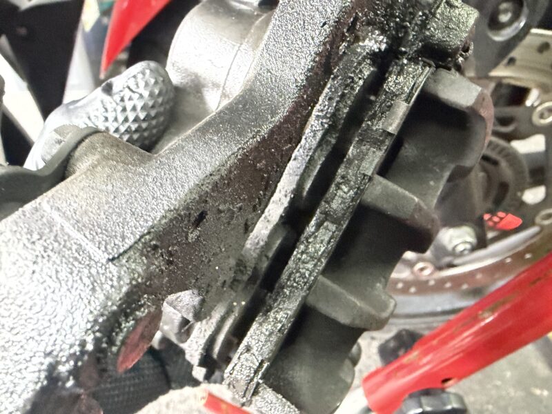 外したキャリパーがこちら。おそらく、漏れたフォークオイルが付着し、さらにそこにブレーキダストやらの汚れがついて、とてもおぞましいことになっています。この汚れは、パーツクリーナーを使って落としておきました。