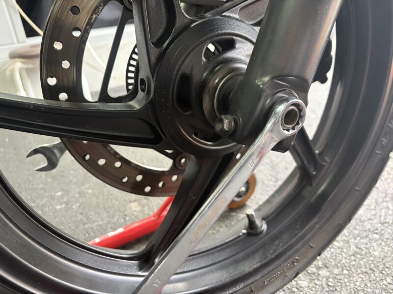 メンテナンススタンドでフロントを持ち上げたら、シャフトを抜いて、ホイールを外してやります。