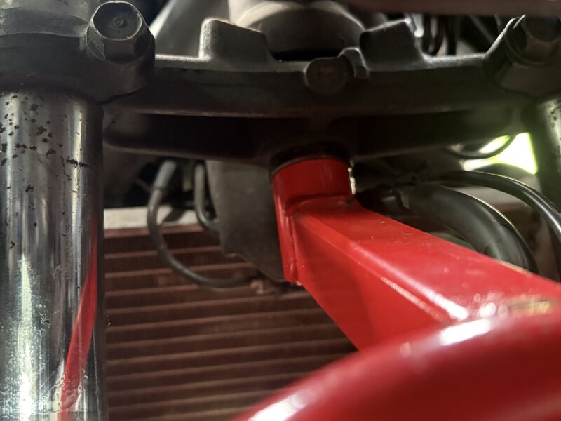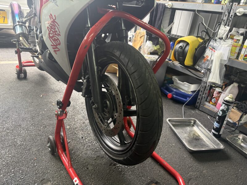 フリーになったブレーキホースをちょっとよけてやることで、このようにメンテナンススタンドを掛けることができるようになります。