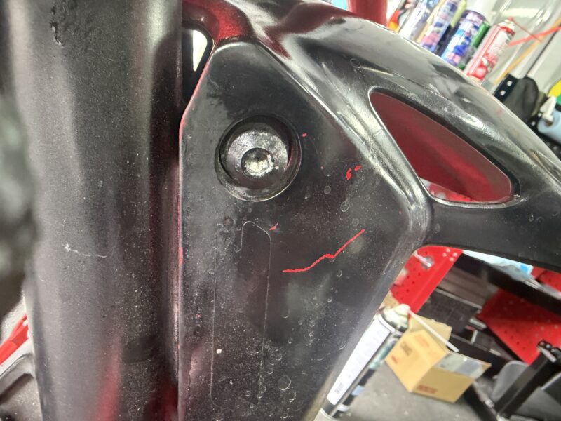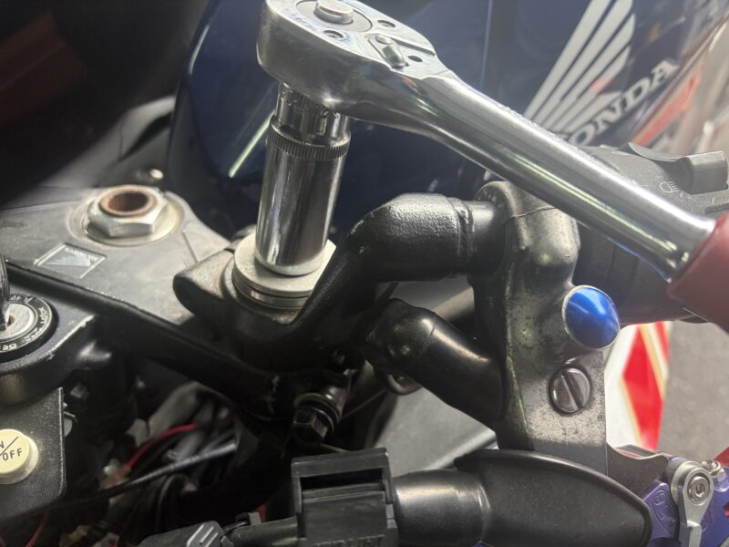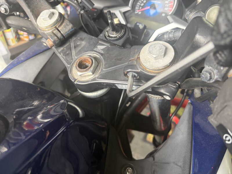 まずは、ハンドルの取り外し。CBR250Rはセパハンなので、ハンドルはフォークに取り付けられています。下写真の位置のボルトを、6ミリの六角レンチで緩めます。