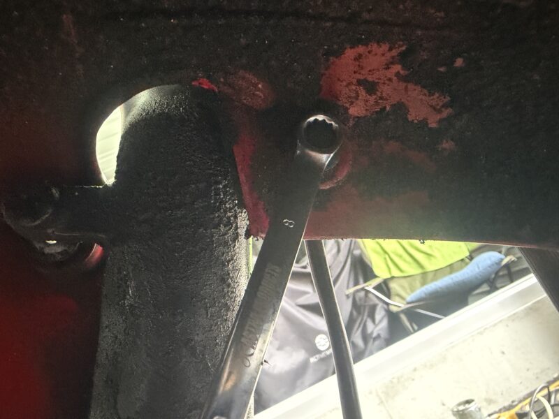 そこで、このブレーキホースをまとめているボルトを10ミリのメガネレンチで外し、ホースを動かせるようにしてやります。