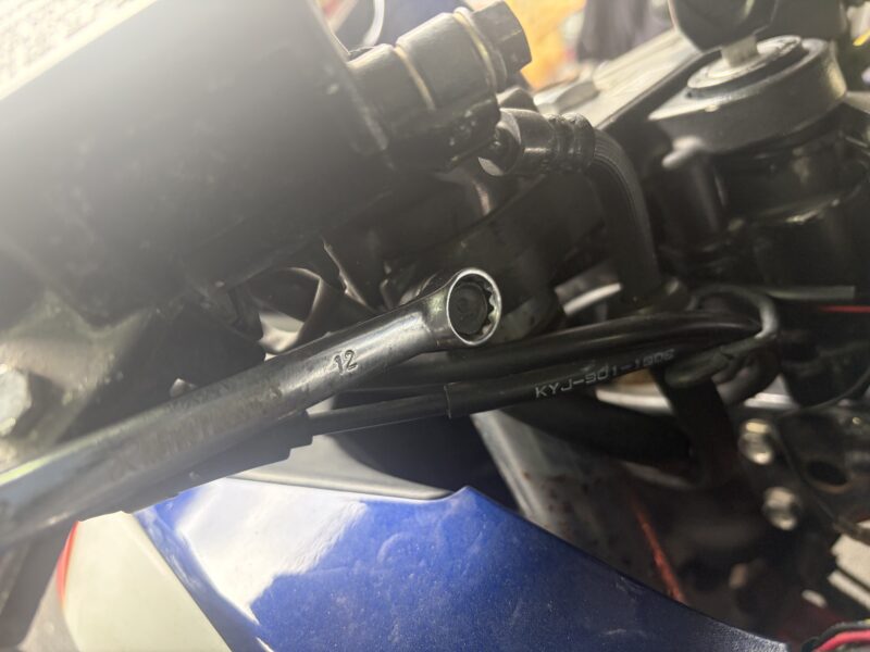 つづいて、トップブリッジのフォーク固定ボルトを12ミリのメガネレンチで緩めます。