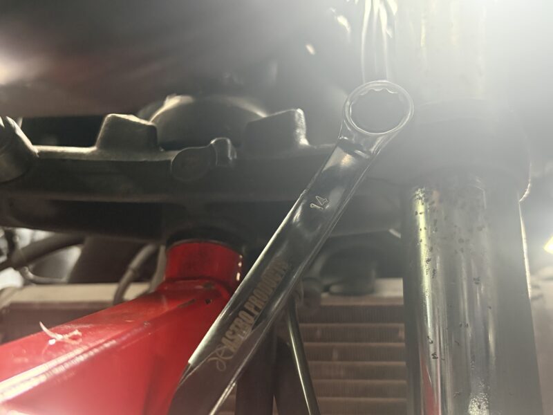 続いて、アンダーブラケットのフォーク固定ボルトを、14ミリのメガネレンチで緩めます。