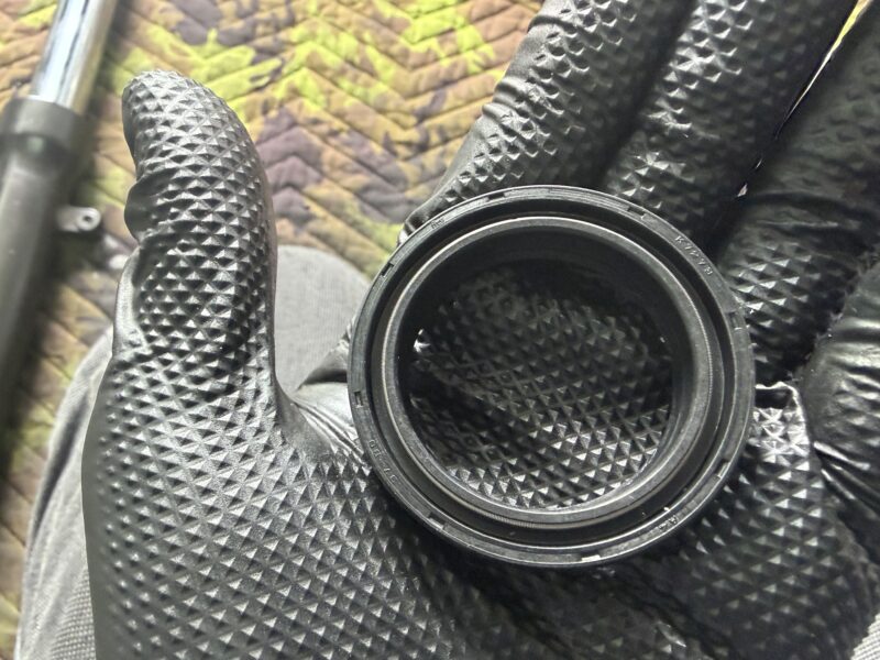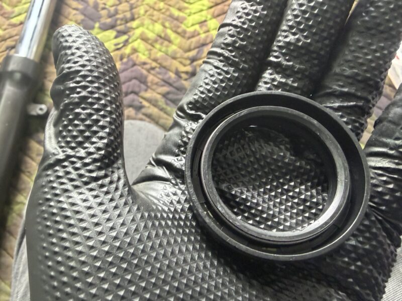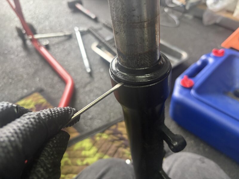 フォークオイルを出し切ったら、ダストシールを外します。細いマイナスドライバーをアウターチューブとダストシールの間に差し込み、てこの原理で持ち上げてやることで簡単に外れます。