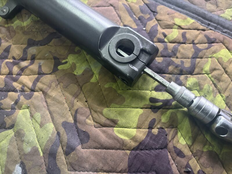次に、アウターチューブのボトムとインナーチューブ内にあるシートパイプを固定しているボルトを外します。6ミリの長い六角のソケットをスピンナハンドルに取り付け、一気にトルクをかけて緩め、外します。ここのボルトはねじロックが打ってあったりするので苦戦することが多いのですが、今回はすんなりいきました。