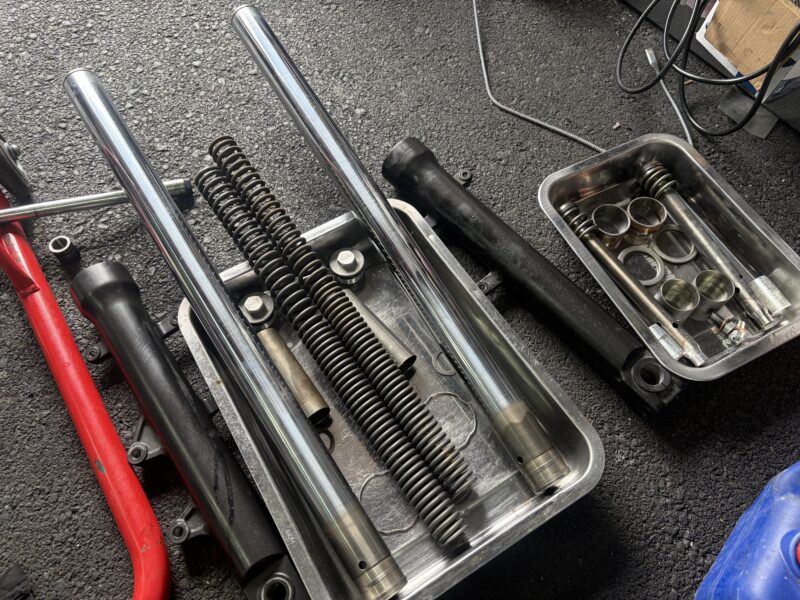そこで早速、オイルが漏れ漏れの漏れなフロントフォークをオーバーホールし、修理していきます。