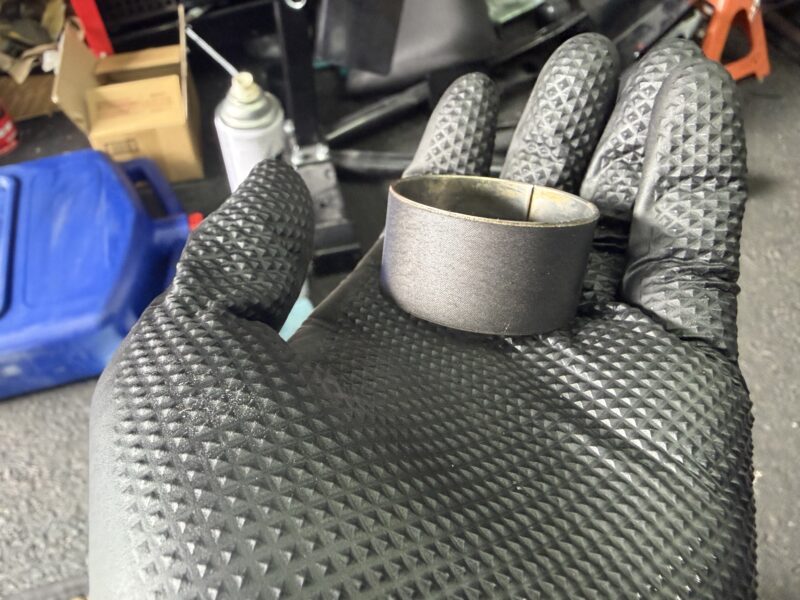 ちなみに、古いブッシュがこちら。コーティングはまだ剥げてはいませんが、ちょっと摩耗して薄くなっている感があります。交換しなくても良かったのかもしれませんが、次にいつフォークを開けるか分からないので、一応交換しておきます。