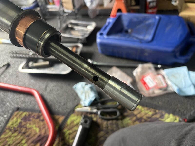 その後、インナーチューブを何度か強めに引き抜く方向に引っ張ってやると、オイルシールが外れ、インナーチューブをアウターチューブから外すことができます。さらにアウターチューブ内にはシートパイプのロックピースが入っているので、こちらも回収しておきます。