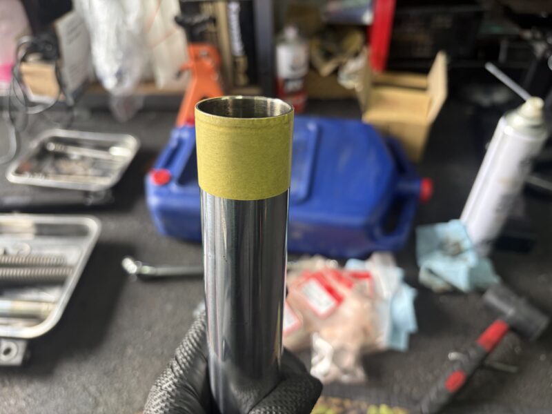 オイルシールを通す前に、ストップリングの溝をマスキングテープで覆い、エッジでオイルシールが傷つかないようにしてやります。