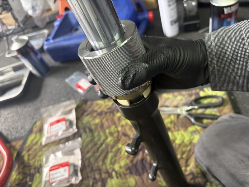 ここで、フォークを車体から取り外す前に、トップキャップを緩めておきます。17ミリのソケットを使用しました。