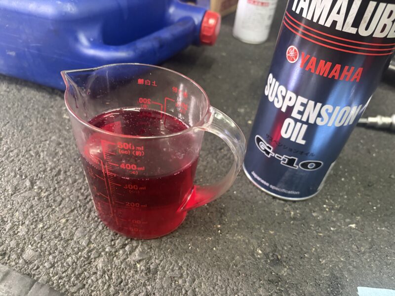 使用したフォークオイルは、ヤマハのG-10。各社の10番はほとんど同じ粘度なので、一番価格がお手頃なヤマハのものを、私は好んで使っています。