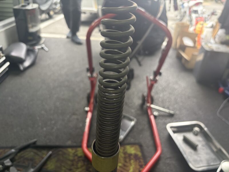 オイルを入れて油面を調整したフォークに、スプリングを入れてやります。巻きが密になっている方を下にして、オイルが跳ねないようにゆっくりと。その後、ワッシャー、カラーの順番で入れます。