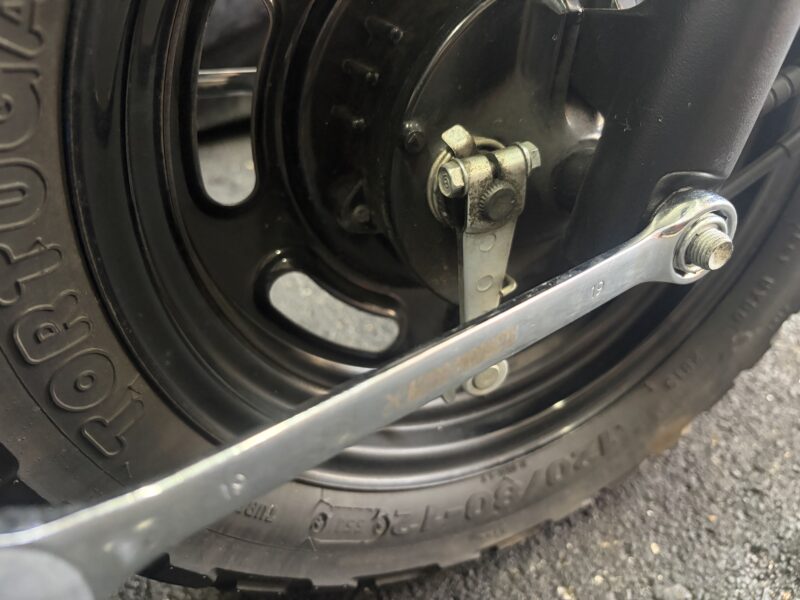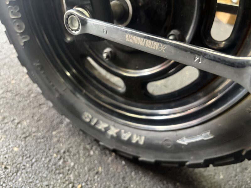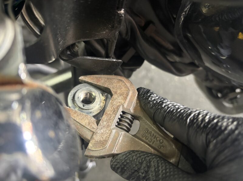 続いて、アクスルシャフトを緩めます。シャフト側は14ミリのメガネレンチで。