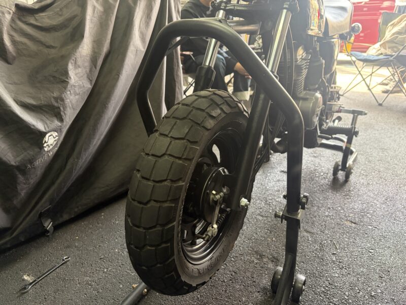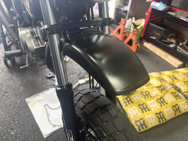 さらにフロントホイールを取り付けて、メンテナンススタンドからおろし、フロントフェンダーを取り付けて、作業完了。