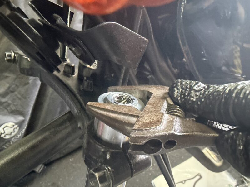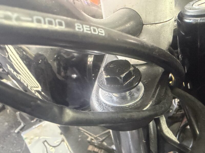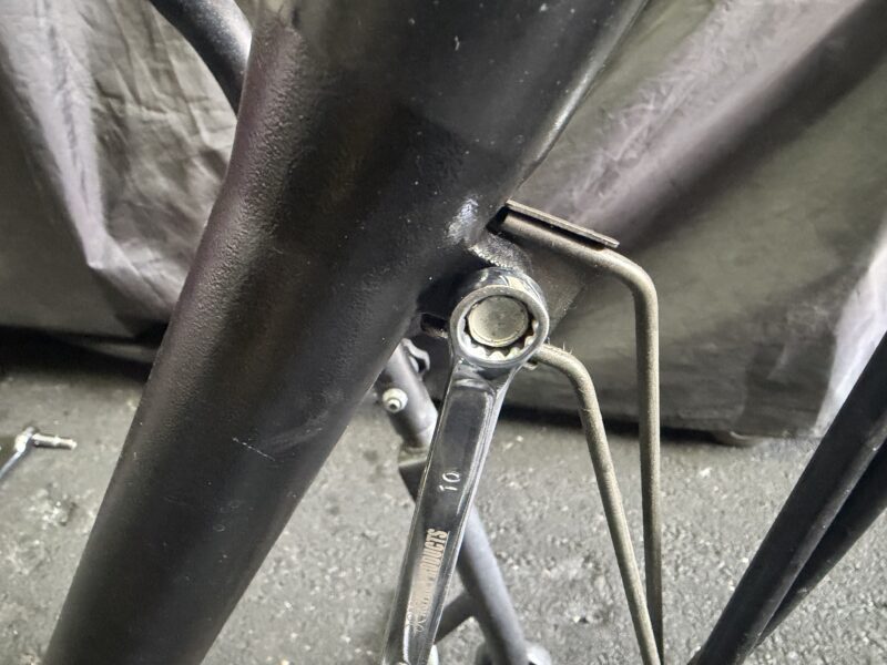 さらに、左のアウターチューブに固定されているケーブルガイドも外します。10ミリのメガネレンチで。