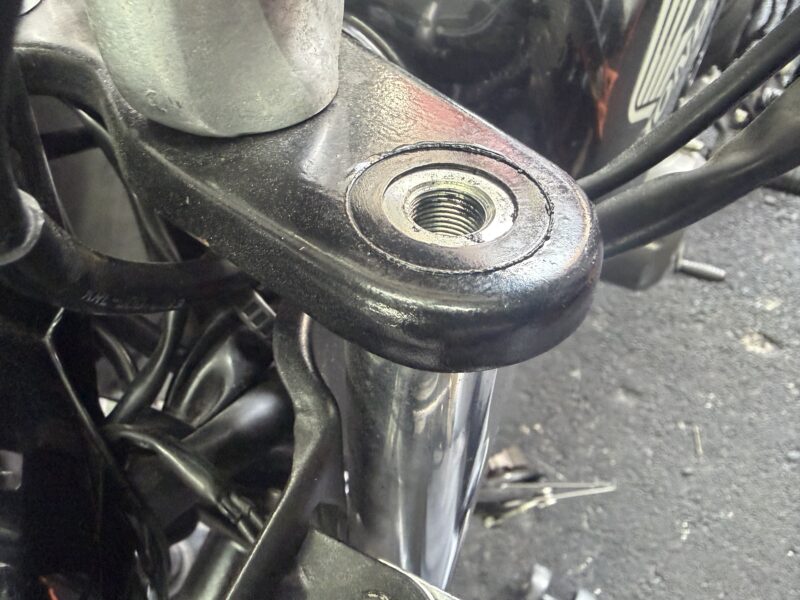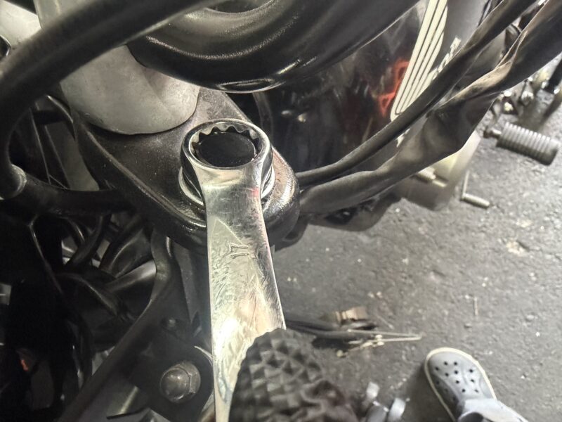 つづいて、トップブリッジでフロントフォークを固定しているボルトを取り外します。17ミリのメガネレンチで。
