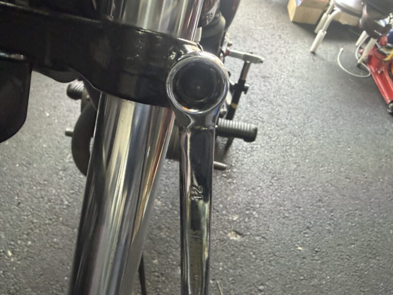 アンダーブラケットのピンチボルトを12ミリのメガネレンチで緩め、フォークを下げてやります。ただし、まだ外さずに、トップキャップがトップブリッジとアンダーブラケットの間にある状態で再度固定。