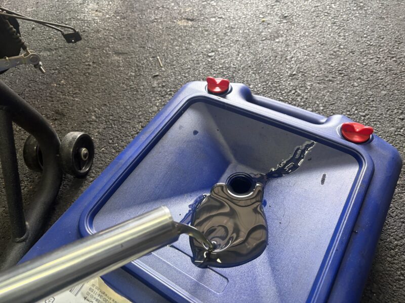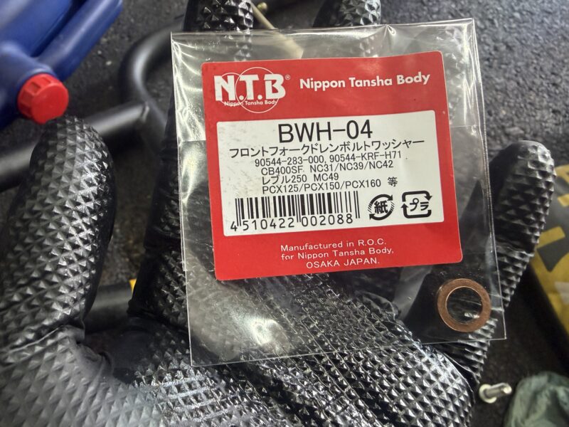 フォークオイルはヤマハのG10を使用しました。粘度はホンダのものと同等で、価格がいくらかお安いためです。また、あとで油面で合わせるため、オイルは多めに200ccほど入れました。