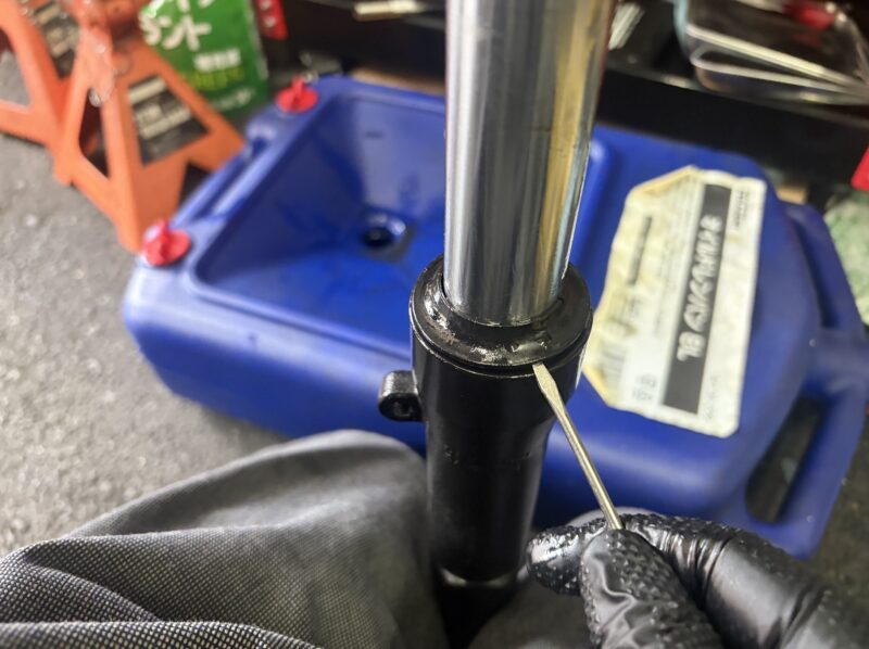 アウターチューブ側に残ったオイルシールの取り外しです。オイルシール下にマイナスドライバーを突っ込み、てこの要領で持ち上げて外しました。