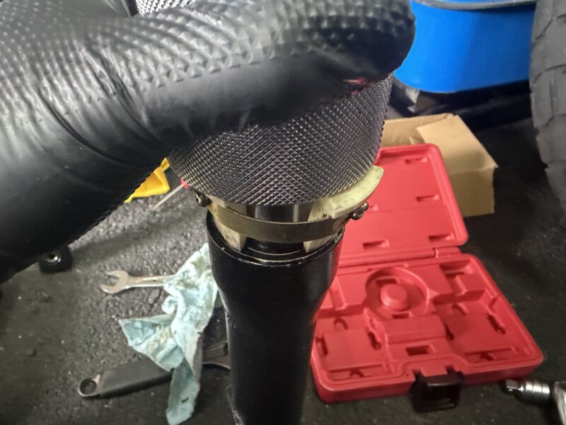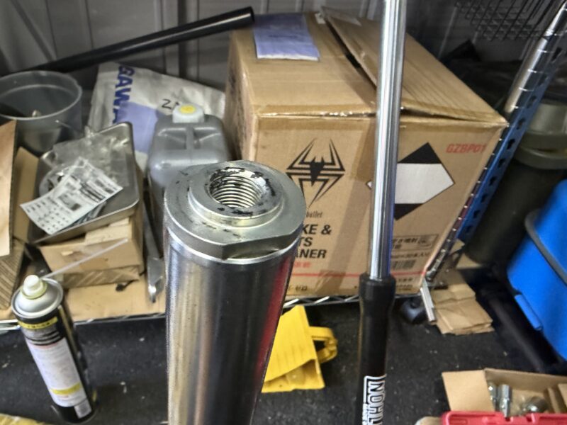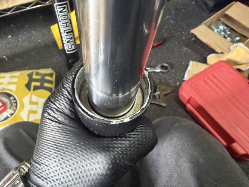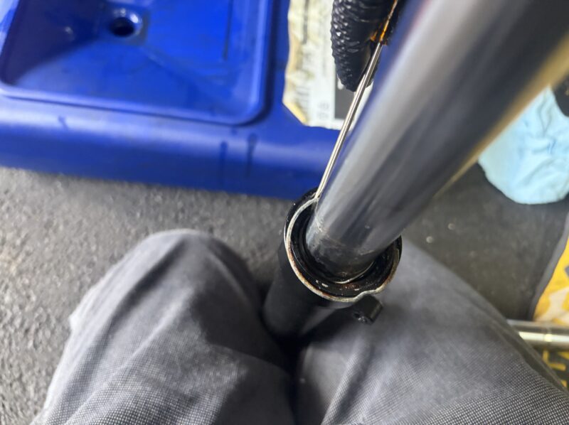 新しいOリングを取り付けたフォークキャップで蓋をして(ただしここでは仮締め)、フォークの組み立て完了。