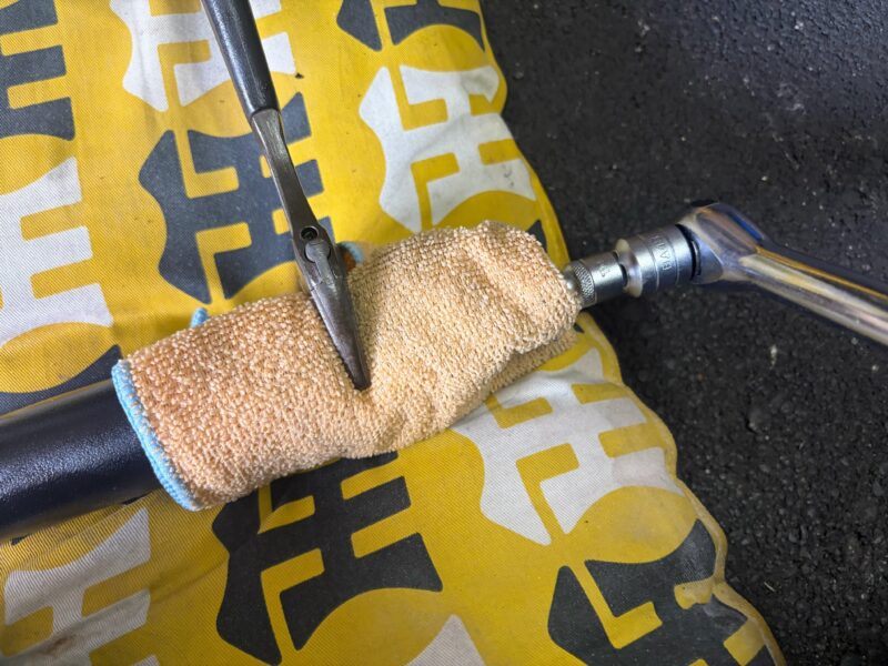 モンキーレンチでアウターボルトをはさんで固定し、6ミリのロングヘキサゴンソケットをスピンナハンドルに取り付けて、一気にトルクをかけました。パキッっといい音がして、ボルトを緩め外すことができました。