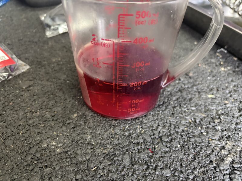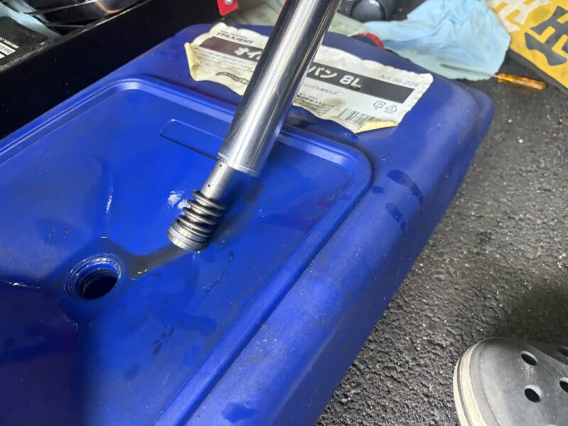 まず、トップキャップを開けて、中の古いフォークオイルを排出します。本来の赤みがまったくなくなり、サラサラとして粘度もなくなったオイルが出てきました。
