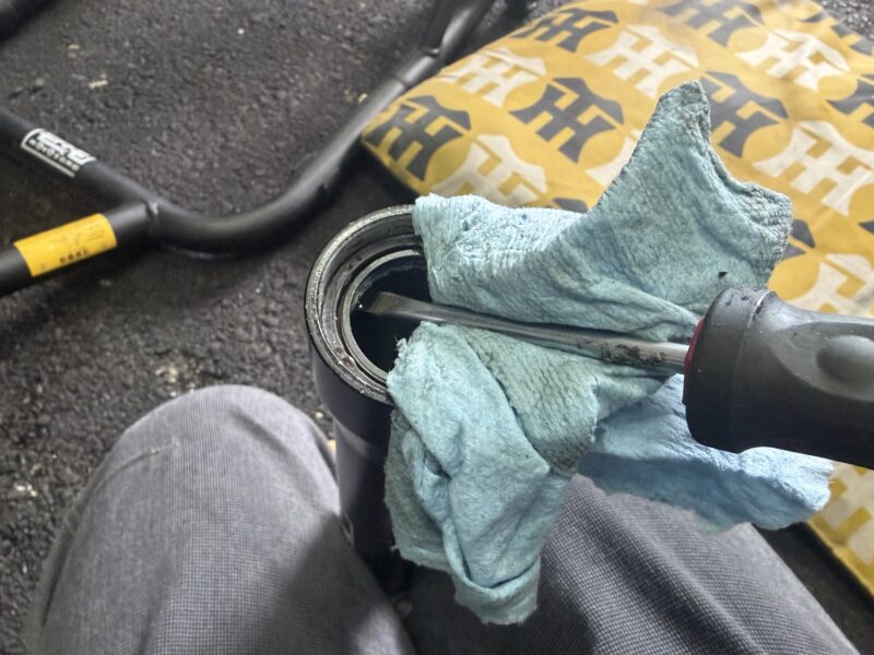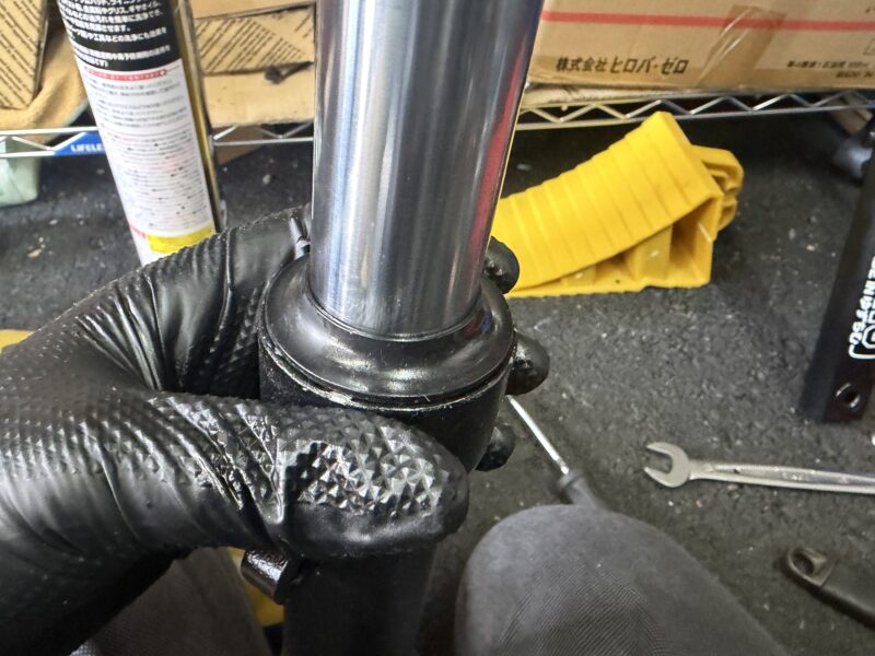 アウターチューブ上部にウエスを巻いていたので垂れてはいませんでしたが、インナーチューブには漏れたフォークオイルがべっとりでした。
