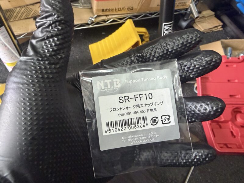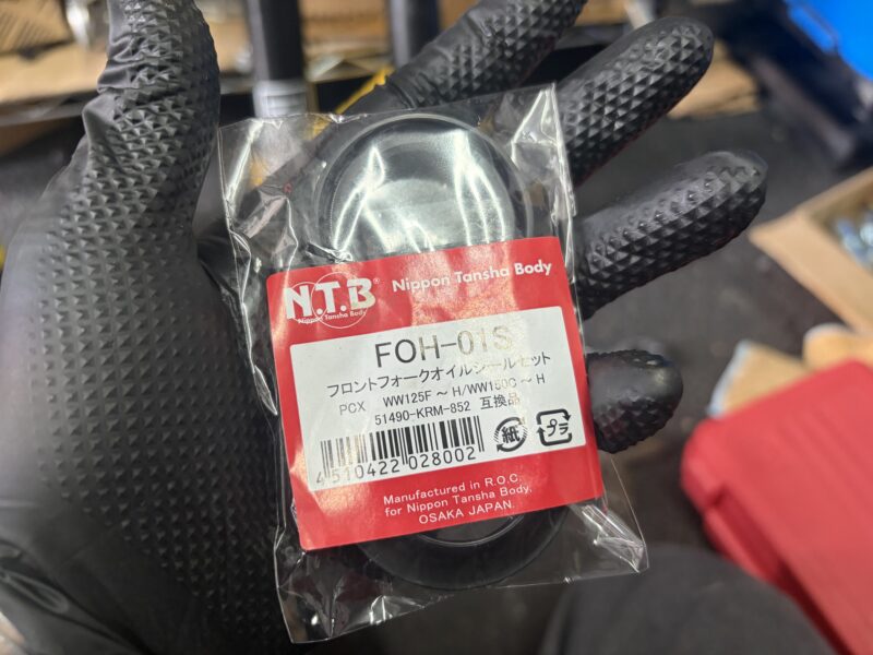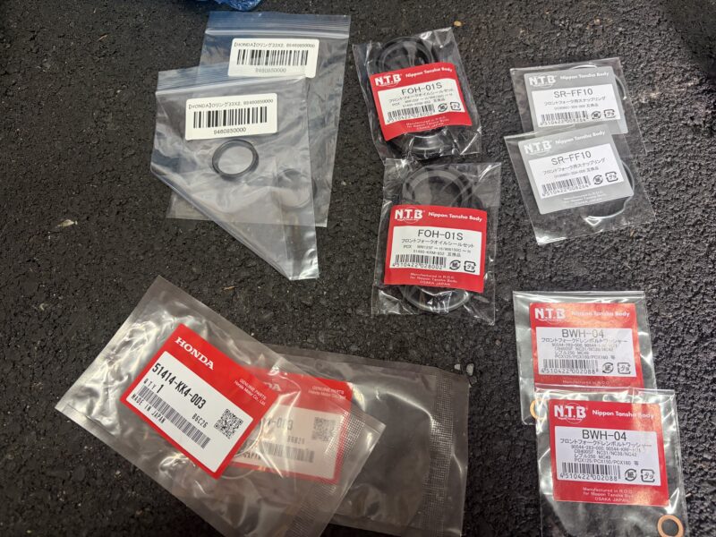 フォークを組み立てるにあたって用意した交換パーツがこれら。一部NTBの純正互換品を使うことで、コストを下げています。