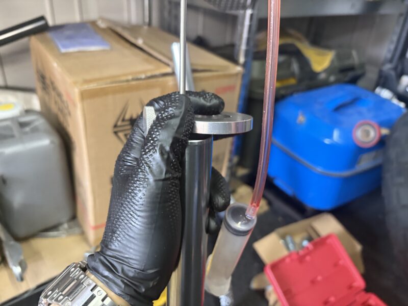 フォークオイルを入れた後、ゆっくりとストロークさせてエア抜きをし、油面調整へ。油面131mmは、油面調整ツールを使って調整しました。