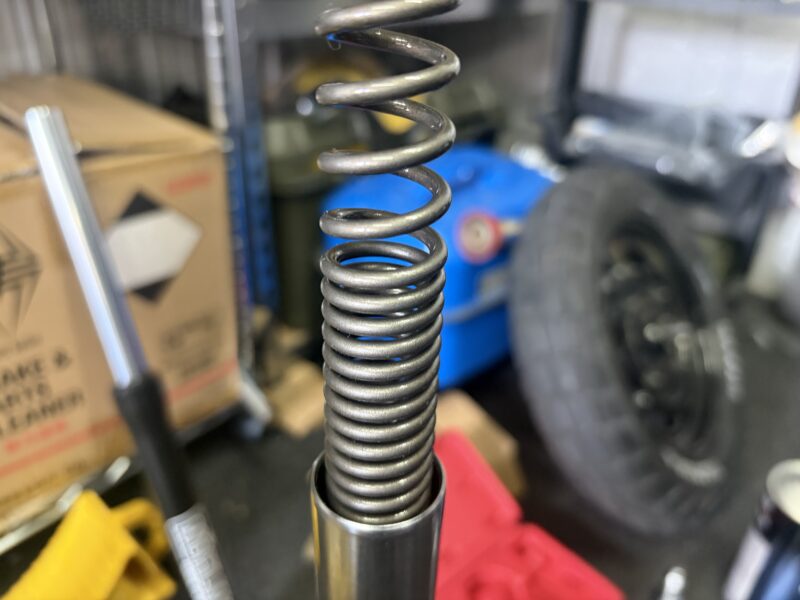 油面調整後、オイルが飛び散らないようにゆっくりとスプリングを入れます。巻きが密になっている方が下になるように。